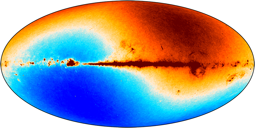 Disse «forgrunnene» er ti ganger sterkere enn bakgrunnsstrålingen i Figur 2, og å fjerne dem fullstendig er avgjørende for å trekke konklusjoner om universets egenskaper. Den store pepsilogo-liknende effekten skyldes at galaksen vår beveger seg gjennom verdensrommet og vi ser en dopplereffekt i bakgrunnsstrålingen, noe som gjør at den ser varmere ut i den ene retningen og kaldere ut i den andre. De diffuse skyene langs midten av bildet er stråling fra blant annet støv i Melkeveien, galaksen vår.
