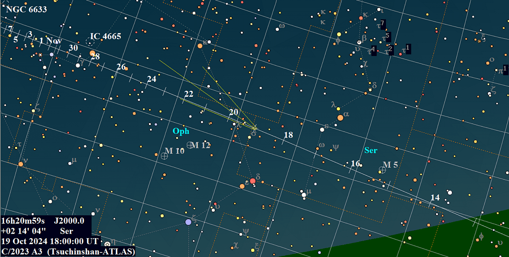 Kartet viser bevegelsen til kometen fra 13. oktober (nederst til høyre) til 7. november 2024. Kometens posisjon er markert spesielt for kvelden 19. oktober, og ellers daglig kl. 20 norsk sommertid. Synsfeltet på kartet er på vel 30 × 50 grader og har nord opp og mot høyre. Kartet viser stjerner og deep sky-objekter ned til størrelsesklasse 7, det vil si objekter som er synlige i prismekikkert. Merk at kometen kvelden 15. oktober er nær kulehopen Messier 5 (M5) i stjernebildet Slangen (Serpens, Ser), og rundt 22. oktober noen grader nord for kulehopene M12 og M10 i stjernebildet Slangebæreren (Ophiuchus, Oph). Kartet er laget med programmet Guide 9.