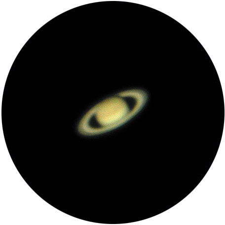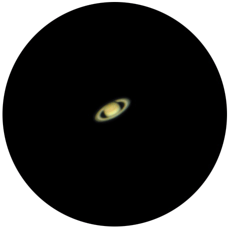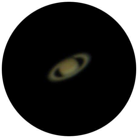 Tre bilder av Saturn slik den ser ut i en 11-tommers reflektor med 400 ganger forstørrelse (til venstre), 5-tommers reflektor med 200 ganger forstørrelse (i midten) og 5-tommers reflektor med 400 ganger forstørrelse (til høyre). Her ser vi tydelig at Saturn i bildet i midten og til venstre er omtrent like lys og tydelig, men at 400 ganger forstørrelse i et 5-tommers teleskop (125 mm) er for mye. Her er Saturn mye mørkere og mer utydelig. Foto: Rocket Roberts