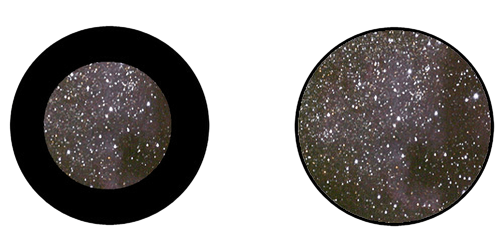 Å se gjennom et teleskop blir litt som å se gjennom et rør. Denne figuren viser forskjellen mellom et vanlig Plössl- okular og et dyrere vidvinkelokular. Okularene har lik forstørrelse, men ulikt synsfelt. Bildet til venstre tilsvarer et Plössl-okular med synsfelt 52 grader, mens det til høyre tilsvarer et vidvinkelokular med 82 grader. Med et vanlig teleskop med diameter 10 cm, brennvidde 90 cm og okular med brennvidde 25 millimeter, blir forstørrelsen 36 ganger. Med okularet til venstre blir synsfeltet til teleskopet 1,4 grader og med okularet til høyre blir det 2,3 grader. Foto: Fjordane Astronett